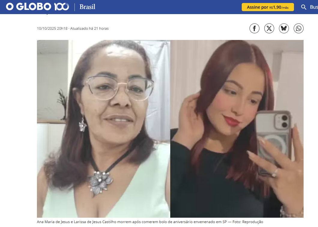 MÃE E FILHA MORREM APÓS COMEREM BOLO ENVENENADO ENTREGUE POR PARENTE, EM SÃO PAULO
